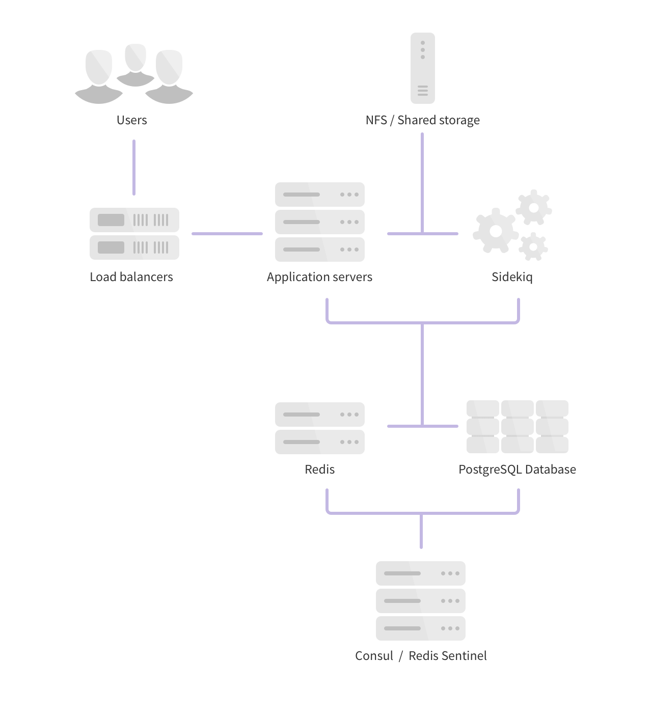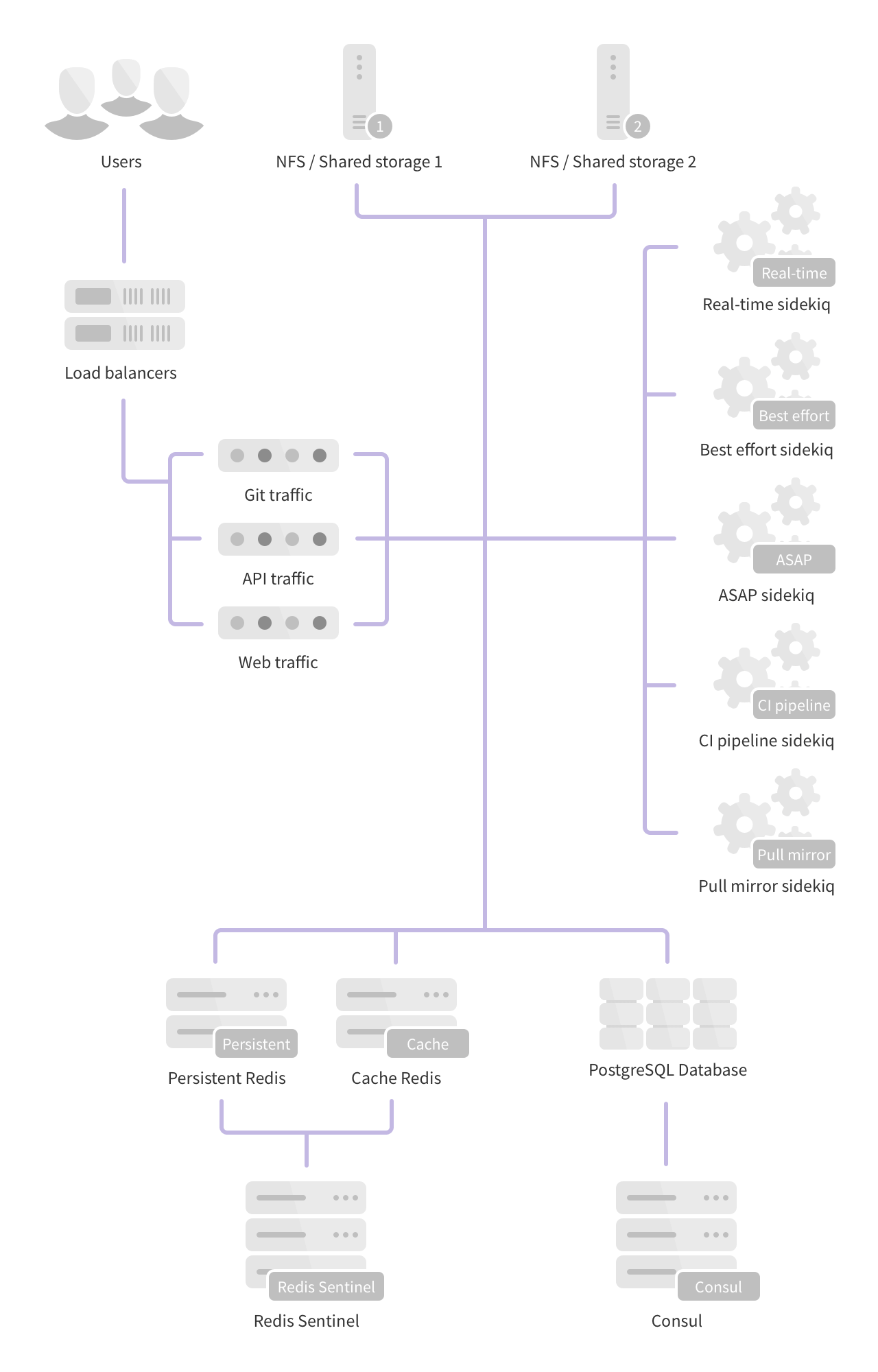 For very large installations, it might be necessary to further split components for maximum scalability. In a fully-scaled architecture, the application node is split into separate Sidekiq and Unicorn/Workhorse nodes. One indication that this architecture is required is if Sidekiq queues begin to periodically increase in size, indicating that there is contention or there are not enough resources.