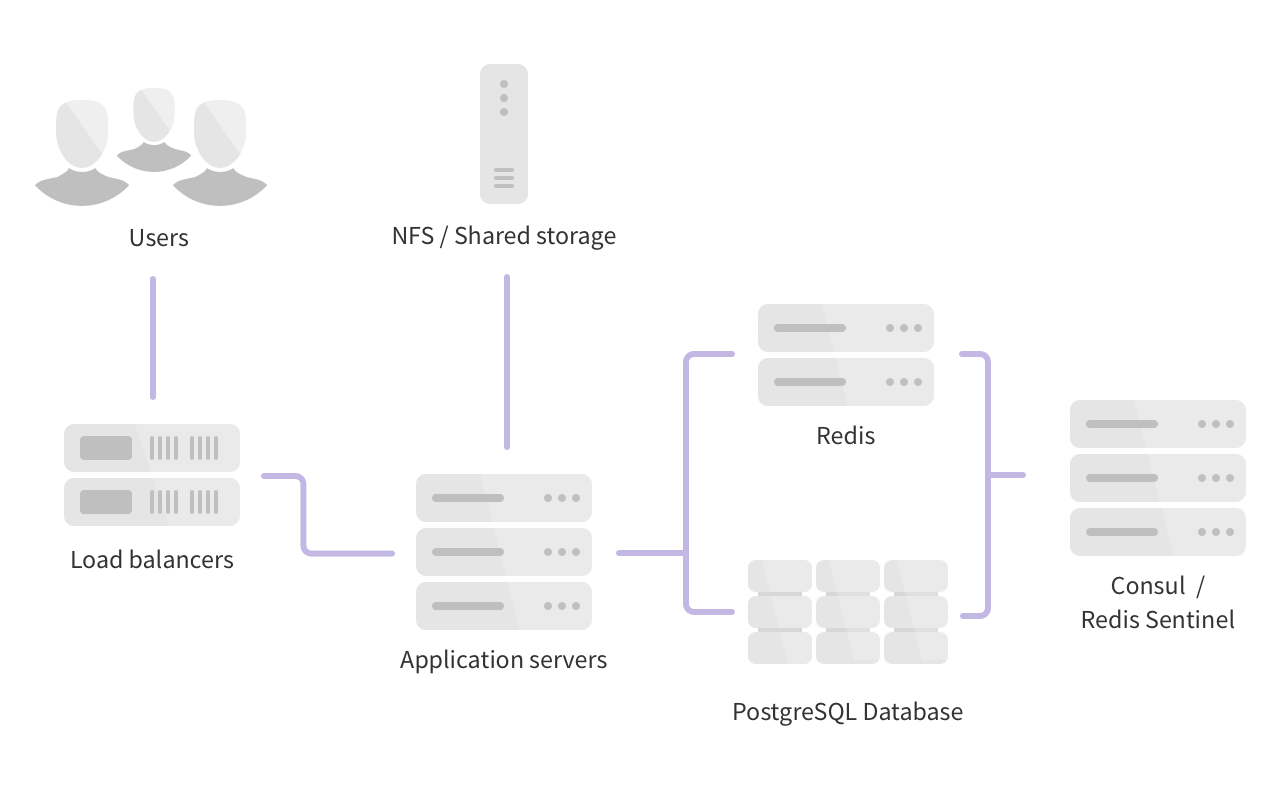This is the simplest form of scaling and will work for the majority of cases. Backend components such as PostgreSQL, Redis, and storage are offloaded to their own nodes while the remaining GitLab components all run on 2 or more application nodes.