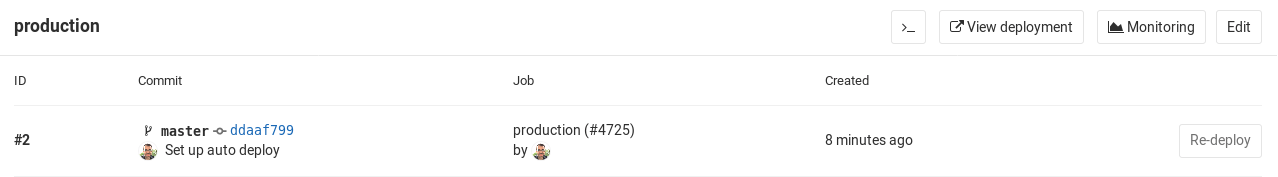 If you have a deployment service such as Kubernetes associated with your project, you can use it to assist with your deployments, and can even access a web terminal for your environment from within GitLab!