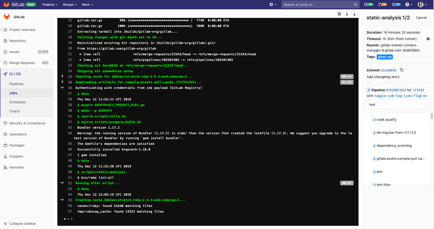 Pipeline mini graphs allow you to see all related jobs for a single commit and the net result of each stage of your pipeline. This allows you to quickly see what failed and fix it.