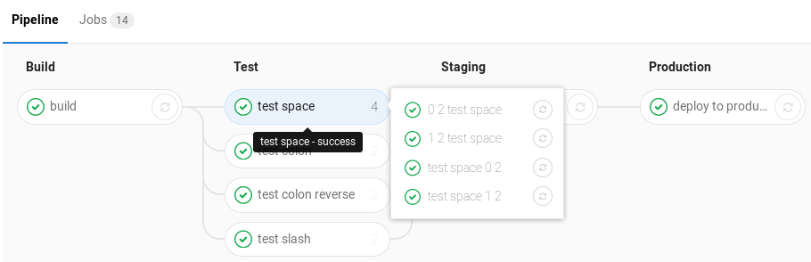 Regular pipeline graphs show the names of the jobs of each stage. Regular pipeline graphs can be found when you are on a single pipeline page. For example: