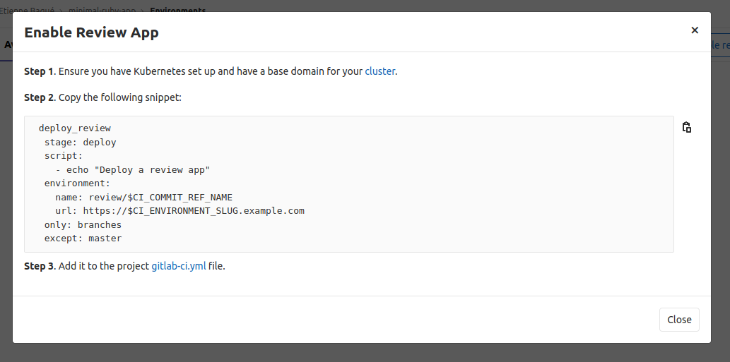 the Enable Review Apps button and GitLab will prompt you with a template code block that
