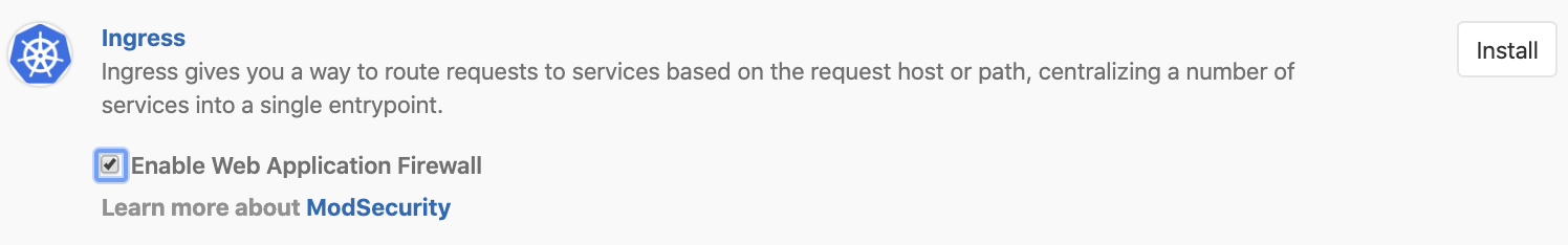 Note: GitLab's Web Application Firewall is deployed with Ingress, so it will be available to your applications no matter how you deploy them to Kubernetes.