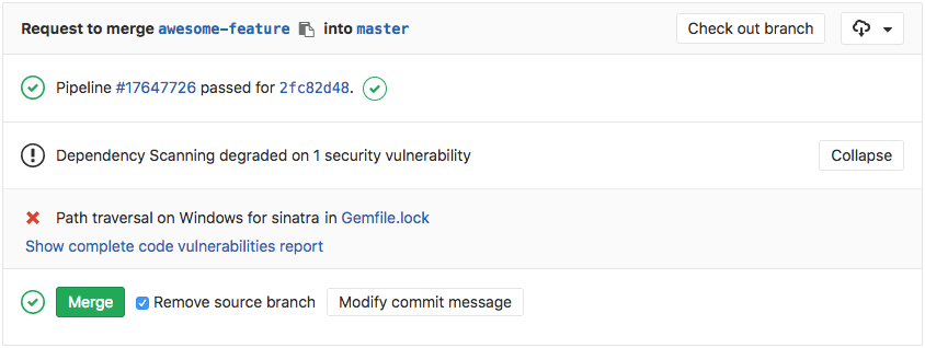 GitLab checks the Dependency Scanning report, compares the found vulnerabilities between the source and target branches, and shows the information on the merge request.