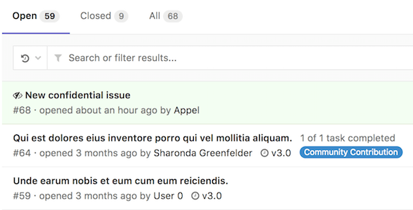 There are a few things that visually separate a confidential issue from a regular one. In the issues index page view, you can see the eye-slash icon next to the issues that are marked as confidential.