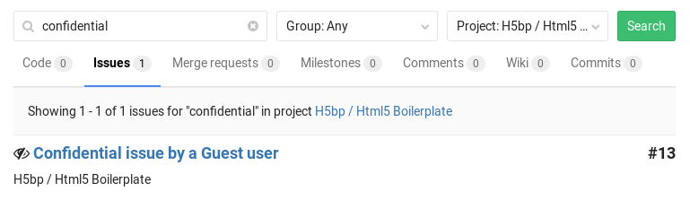 Confidential issues are also hidden in search results for unprivileged users. For example, here's what a user with Maintainer and Guest access sees in the project's search results respectively.