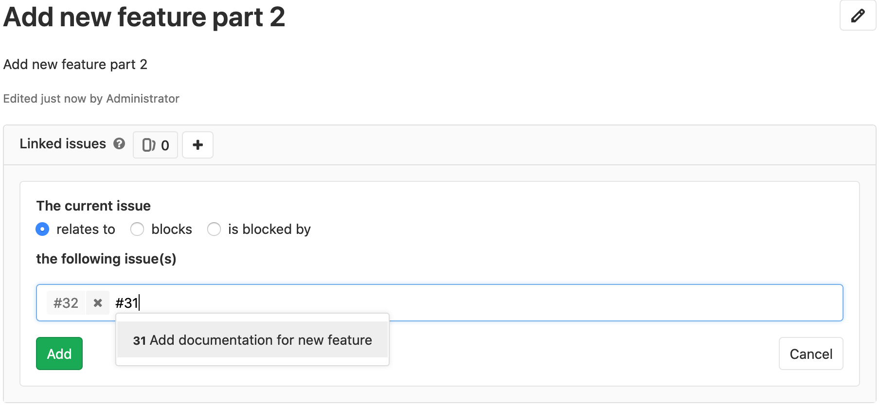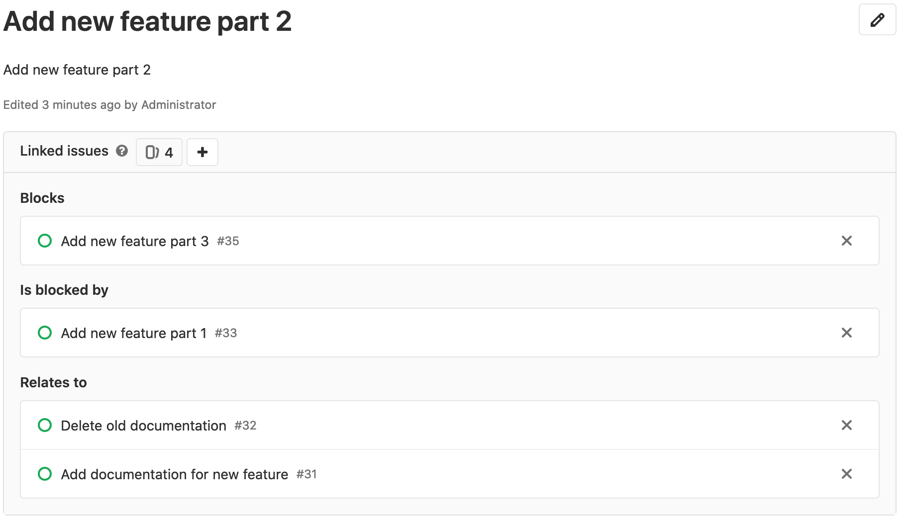 Related issues are a bi-directional relationship between any two issues and appear in a block below the issue description. Issues can be across groups and projects.