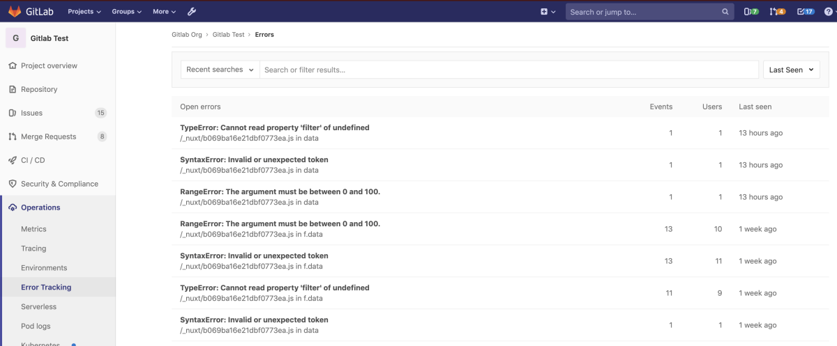 - You can now visit Operations > Error Tracking in your project's sidebar to view a list of Sentry errors.