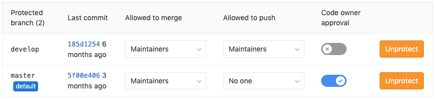When enabled, all merge requests targeting these branches will require approval by a Code Owner per matched rule before they can be merged. Additionally, direct pushes to the protected branch are denied if a rule is matched.