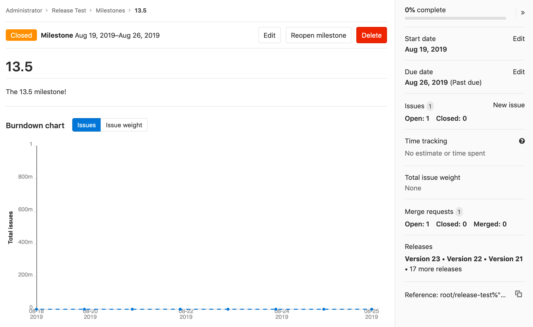 Below is an example of milestones with no Releases, one Release, and two Releases, respectively.