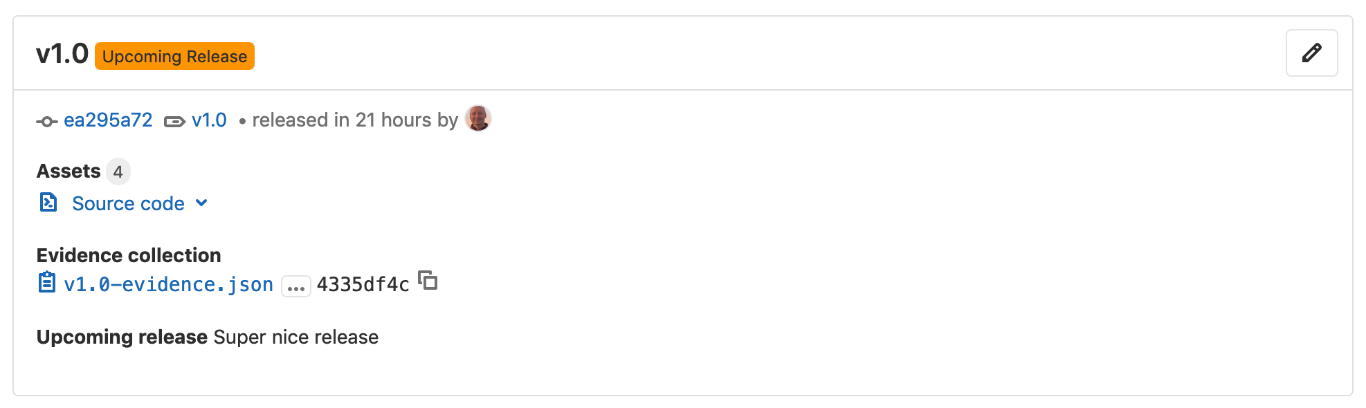 The gathered evidence data is stored in the database upon creation of a new release as a JSON object. In GitLab 12.6, a link to the evidence data is provided for each Release.