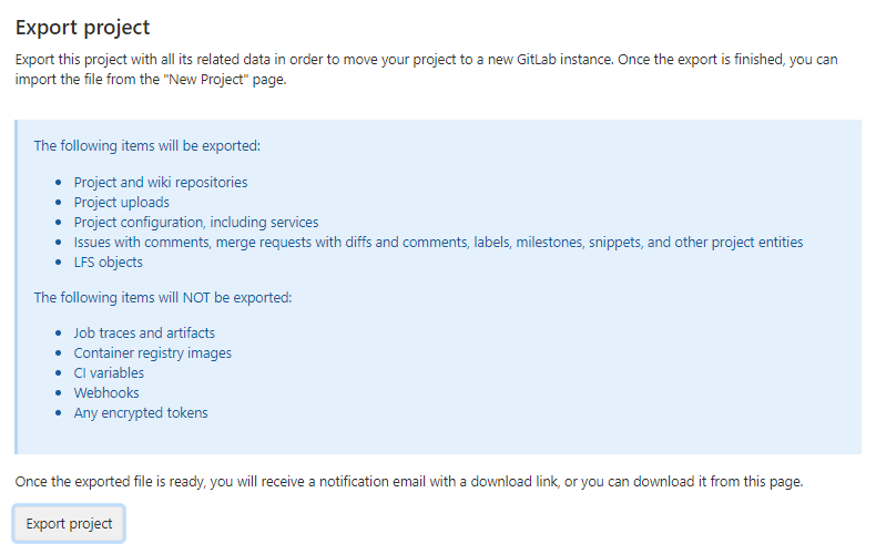 - Imports will fail unless the import and export GitLab instances are compatible as described in the Version history.